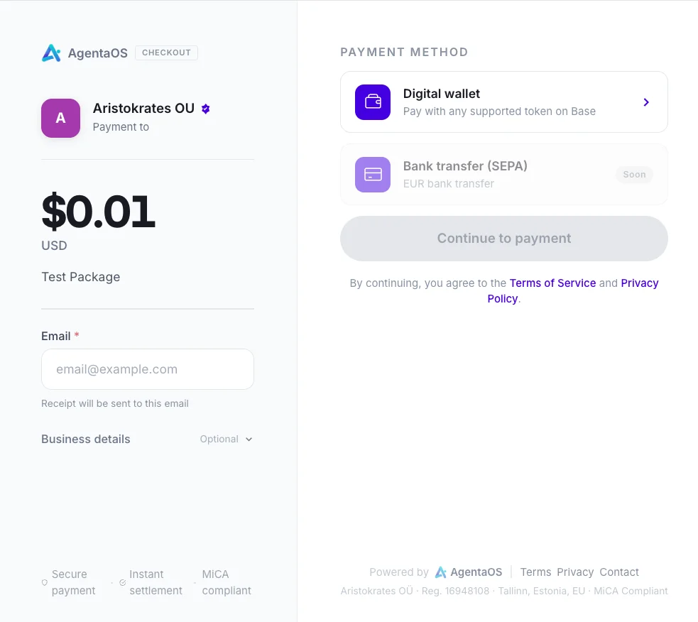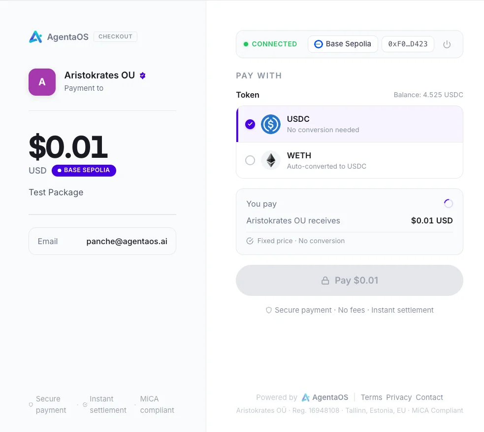 "My Estonian company invoices in EUR. My Swiss client pays in ETH. AgentaOS generates the invoice, the client pays from Switzerland, and I get EUR in my virtual bank account. My accountant never sees crypto."